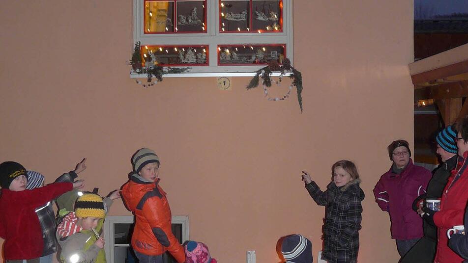 Quer durch das Dorf wird täglich an einem Haus die Jalousie hochgezogen. Zum Vorschein kommt dann ein adventlich geschmücktes Fenster zum Vorschein. Natürlich gibt es dann für die Kinder Süßigkeiten. Am Haus von Petra Göttlicher wurde am ersten Dezember das erste Türchen geöffnet.