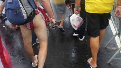 Schuhwerk-Tausch Bus fahren machte absolut keinen Sinn. Wer weiß, wie weit der durchkommt. So wechselte ich schnell meine Schuhe von Sneakers auf Flip-Flops und begab mich zu Fuß auf den Weg zur Metro. Das Ganze war schon sehr risikoreich. Teilweise stand das Wasser kniehoch. Zudem kam eine leichte Strömung und der Untergrund war nicht sichtbar und teilweise arschglatt. Wäre ich hingefallen, hätte ich wohl abbrechen müssen. Aber nach 45 Minuten kam ich erleichtert und völlig durchnässt an der Metrostation an. Ticket hatte ich natürlich keines, aber ich wurde einfach durchgewunken. Die Metro fuhr dann eine gute halbe Stunde. Von dort ging es noch fünf Minuten mit dem Bus und zehn Minuten zu Fuß zum Stadion.