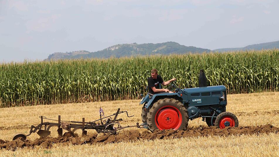 Unweit davon pflügt Stefan Rehm aus Ermreus mit seinem gepflegten Lanz D906, Baujahr 1955 und 19 PS stark, mit einem Zweischarpflug von 1943 das Feld. "Von diesem Bulldog wurden nur 600 Einheiten gebaut", weiß Rehm. Noch immer dominieren die Lanzbulldog das Geschehen mit ihrem Auftreten.