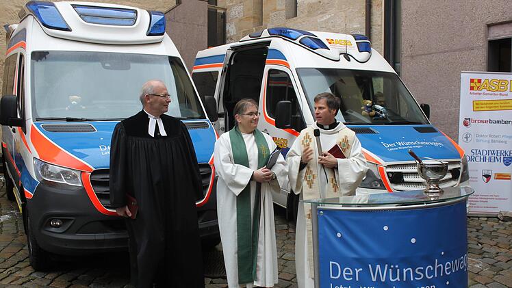 Die ehrenamtlichen Begleiter sind Fachkräfte aus den Bereichen Medizin, Alten- oder Palliativpflege, Rettungsdienst und Psychologie. Danach bat ASB-Geschäftsleiter Sebastian Beetz die Diakonin Beate Wagner, den katholischen Priester Matthias Steffel und den evangelischen Pfarrer Enno Weidt den Wünschewagen Franken zu segnen.
