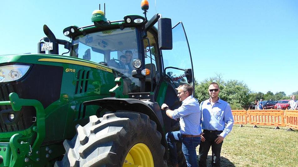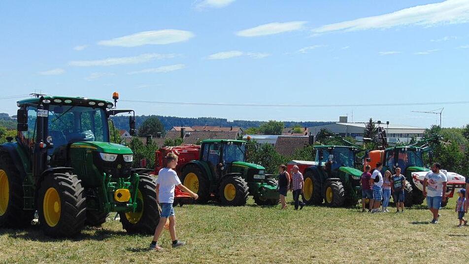 Die immer größer und vor allem immer moderner werdenden landwirtschaftlichen Geräte und Maschinen faszinieren. Drei große John Deere werden gerade über eine Wiese an Heuquadern und Heuballen vorbei gelenkt. Diese modernen Traktoren mit GPS-Empfänger wollen viele Besucher fahren, die nicht nur deshalb zum "Tag der offenen Tür" im landwirtschaftlichen Dienstleistungsbetrieb Krämer nach