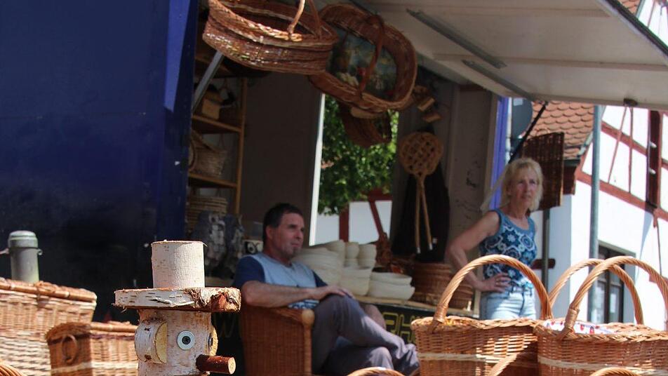 Für die Eheleute Hack aus Pinzberg ist der Forchheimer Jahrmarkt "ein Heimspiel". In der Nürnberger Straße präsentieren sie ihre Korbwaren. Auch für sie sind die Mai-Märkte "immer schwierig". "Normalerweise hätte wir gar keine Zeit ein Gespräch zu führen, aber heute sind überhaupt kaum Kunden da", bekräftigt die Korbhändlerin. Sie bleibt aber optimistisch: Sobald in einigen Wochen die Kirschenzeit beginnt, würden ihre Pinzberger Kirschenkörbe bald wieder zu Verkaufsschlagern werden. "Wir müssen die Jahrmärkte nehmen, wie sie sind, wir können die Besucher ja nicht beeinflussen."