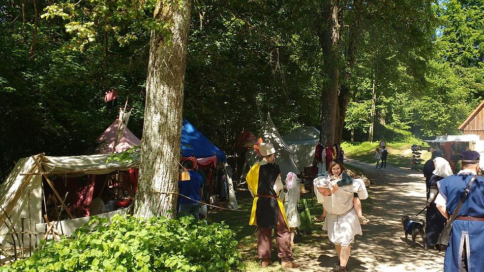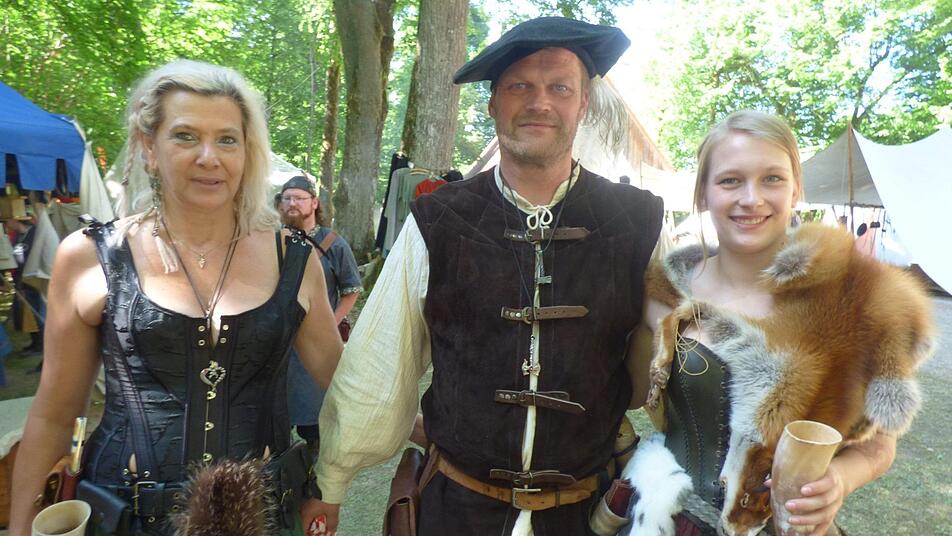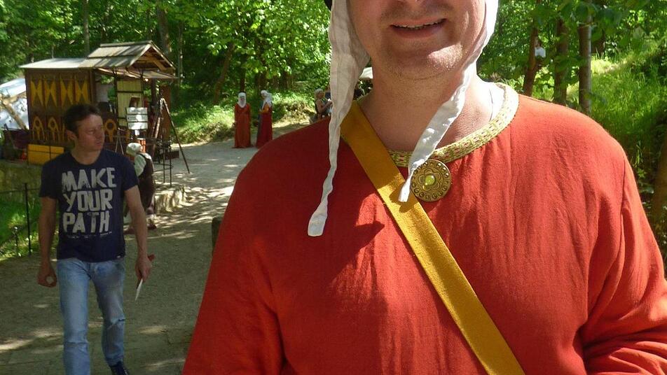 Die Barden Angus und Arnulf unterhalten die Besucher mit mittelalterlichen Weisen. Auch viele Besucher sind historisch gewandet erschienen. So zum Beispiel Nadja Weise, die eine "Völva" darstellt und ihren "Mittelaltervater" Michel, den freien fränkischen Barbar, mitgebracht hat. Etwa 300 nach Christus soll die Völva gelebt haben, meint Weise. Oder der Burgvogt aus Nürnberg, den seine Frau und sein Burgfräulein begleiten.