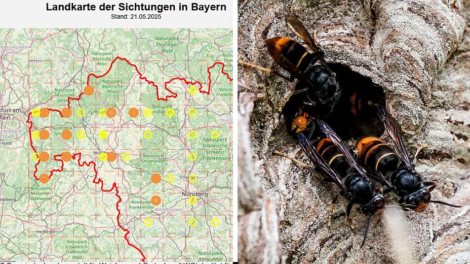Laut einer aktuellen Karte von beewarned.de wurden in Franken besonders viele Asiatische Hornissen in Unterfranken, vor allem rund um Würzburg vermerkt (Stand: 21.05.2025). Auf der Seite kann man auch Sichtungen der invasiven Insektenart melden. Für die Nestfindung haben sich mittlerweile verlässliche Methoden etabliert, wie der Bau von Locktöpfen.
