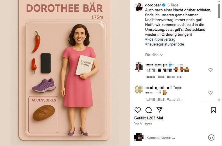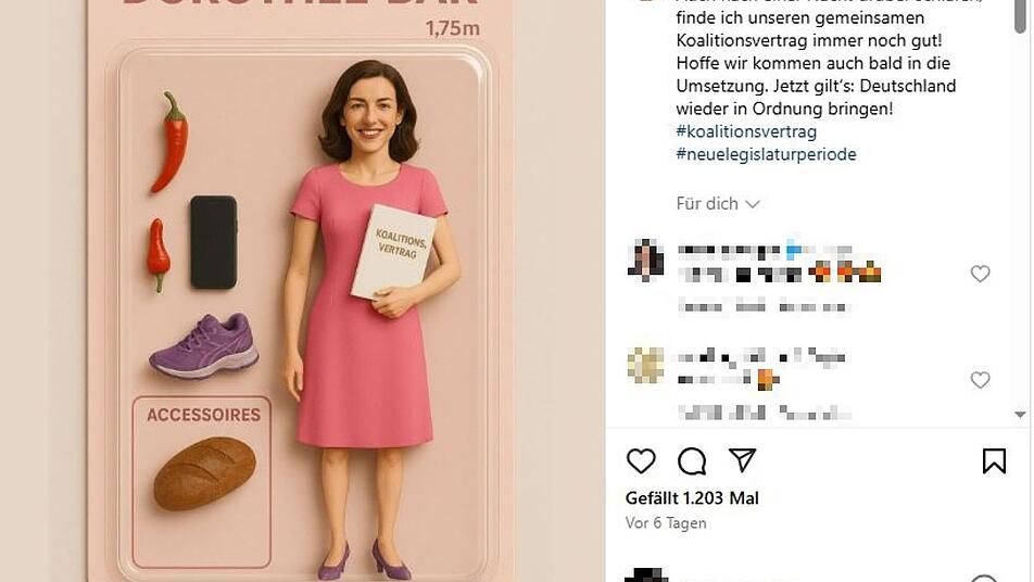 "Auch nach einer Nacht drüber schlafen finde ich unseren Koalitionsvertrag immer noch gut", schreibt die stellvertretende CSU-Vorsitzende in einem Instagram-Post. Darin präsentiert sie ein Bild ihrer generierten Action-Figur, die ebendiesen Vertrag in den Händen hält. Mit einem pinken Kleid und lila Stöckelschuhen bekleidet, steckt eine Mini-Version der 46-Jährigen in einer Verpackung mit der Aufschrift "Dorothee Bär 1,75 m". Als Zubehör sind dem KI-Spielzeug zwei Chilischoten, ein Handy, lila Laufschuhe und ein Brot beigelegt.