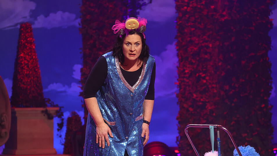 Ines Procter als "Putzfraa" steht während der Generalprobe für die BR-Sendung "Fastnacht in Franken" auf der Bühne.