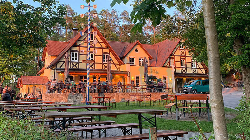 Der Pretzfelder Keller ist ein beliebter Bierkeller in der Fränkischen Schweiz und hat es in unserem Ranking auf den 9. Platz geschafft. Eingebettet in die malerische Landschaft, bietet er unter schattigen Kastanienbäumen eine entspannte Atmosphäre. Hier wird das bekannte Pretzfelder Bier ausgeschenkt, das direkt aus der örtlichen Brauerei stammt.