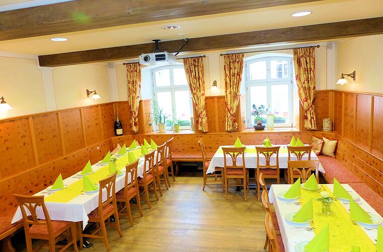 Neben der gemütlichen Gaststube lädt im Sommer ein Biergarten zum Verweilen ein. Besonders bekannt ist das Lokal für seine Karpfen- und Wildgerichte.