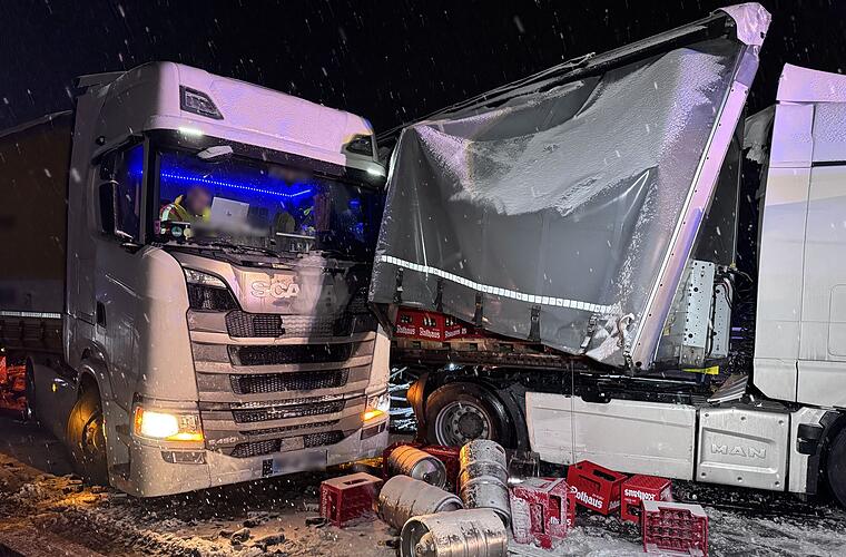 Lkw kollidieren auf A72 bei Hof: In Oberfranken wurde am frühen Montagmorgen (26. Januar 2026) gegen 1 Uhr die A72 bei Hof teilweise gesperrt. Zwischen den Anschlussstellen Hof-Töpen und Hof-Nord war die Fahrbahn in Richtung A9 blockiert, nachdem ein mit Leergut beladener Lastwagen auf schneeglatter Fahrbahn ins Rutschen geraten war. Ein dahinter fahrender Lkw fuhr auf. Beide Fahrer wurden verletzt. Trümmer und Ladung blockierten die Fahrbahn. Einer der Lastwagen sei komplett aufgerissen worden, erklärte ein Feuerwehrsprecher. Demnach habe sich die Ladung auf der Fahrbahn verteilt. Der Sachschaden beläuft sich auf rund 100.000 Euro.