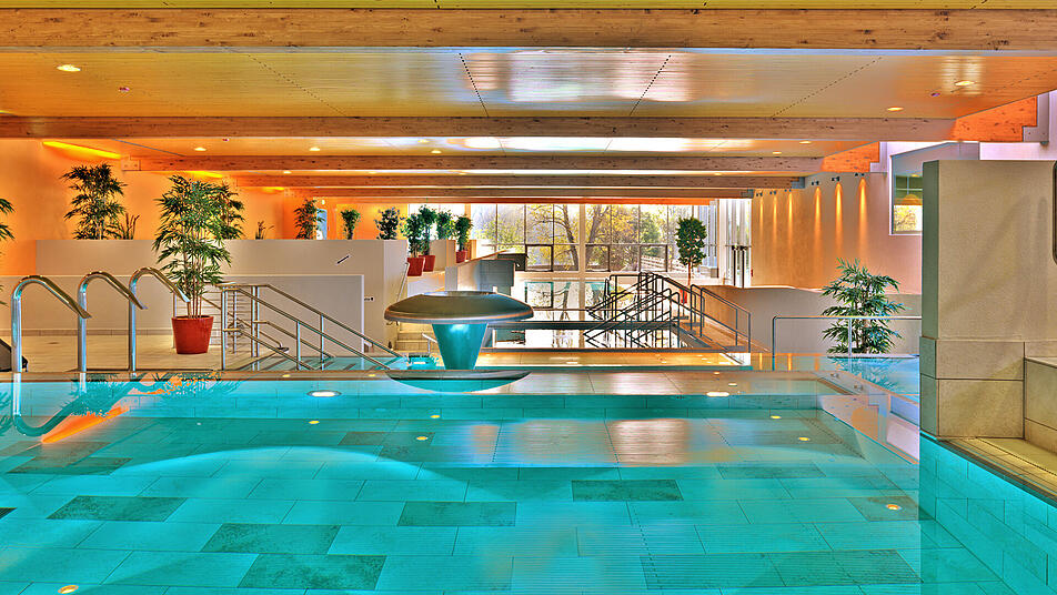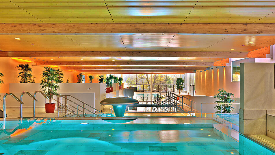 Das Therapiebecken ist mit Bodensprudlern und Sitzbuchten ausgestattet und verfügt über Unterwasserlautsprecher für den kostenlosen Kurs "Aqua Sound". Für Kneipp-Wechselbäder stehen Kalt- (12–16 °C) und Warmbecken (34–38 °C) sowie ein Dampfbad zur Verfügung. Außerdem lädt das 25 Meter lange Außenbecken zum Schwimmen ein. Im Außenbereich findest du zudem eine Liegewiese mit kostenlosen Liegen, einen Barfußweg und ein Rasenschach-Spiel. Zur weiteren Entspannung sorgt ein Außentherapiebecken, welches Sitzbuchten und Massagedüsen verfügt.