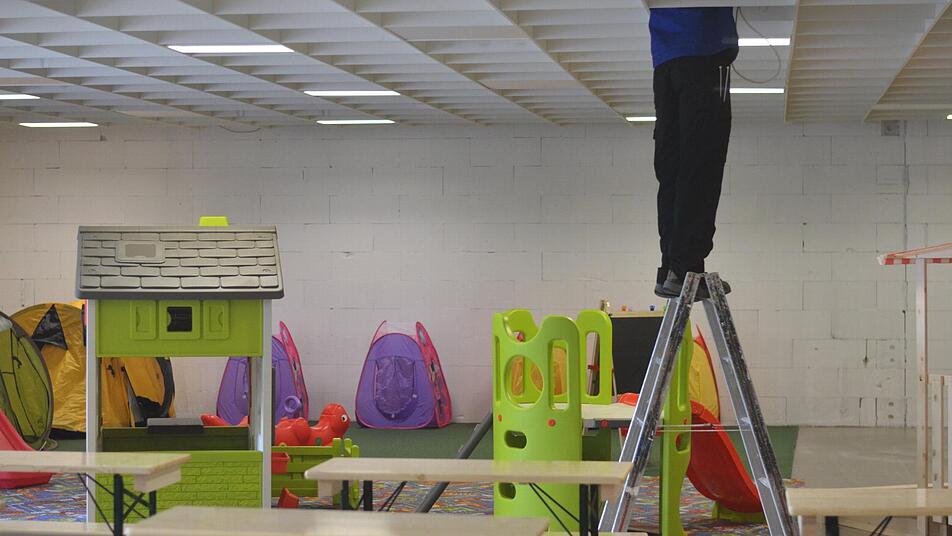 In der letzten Woche wurde das ehemalige Möbelhaus zu einem provisorischen Flüchtlingslager umgebaut. Mit Bauzäunen wurden kleine Kojen abgetrennt, in denen mehrere Stockbetten aufgestellt wurden. Gleich nebenan gibt es einen Essensbereich, in dem die Flüchtlinge mit Mahlzeiten versorgt werden sollen. Auch zahlreiche Tische und Stühle sind bereits montiert. Selbst an einen kleinen Spielbereich für die Kinder wurde gedacht.