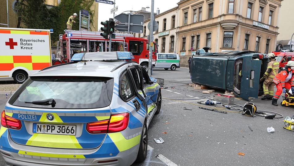 Gegen 16.15 Uhr war ein Polizeiauto auf einem Weg zu einem Einsatz in der Südstadt. Dort war eine Frau von einem Mann geschlagen worden. Auf der Kreuzung Schwabacher Straße/Theresienstraße kam es dann zum Unfall: Das Polizeiauto kollidierte mit einem VW-Bus, die beiden Polizisten erlitten mittelschwere Verletzungen.