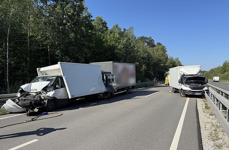 Kurz danach prallte ein Lkw aus noch ungeklärter Ursache auf die beiden stillstehenden Fahrzeuge. Der 30-jährige Transporterfahrer wurde dabei von einem der abgestellten Transporter erfasst und schwer verletzt. Ein Rettungshubschrauber brachte den Mann in ein Krankenhaus. Auch der Lkw-Fahrer (61 Jahre) und der Fahrer des Pannenfahrzeugs (27 Jahre) erlitten Verletzungen und mussten zur medizinischen Versorgung in Krankenhäuser eingeliefert werden.