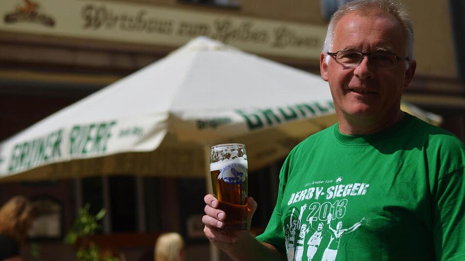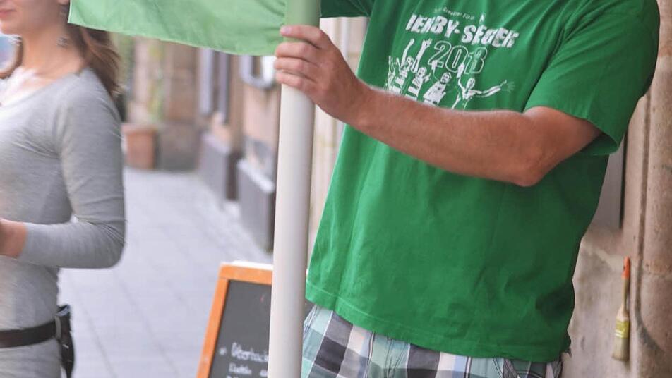 An diesem Morgen gibt es auf der Gustavstraße nur ein Thema: der historische Derby-Sieg der "kleinen" Fürther gegen die "großen" Nürnberger. "Als Fürther kannst Du normalerweise nie den Sportteil lesen. Heute stehen wir sogar auf der Titelseite", sagt ein Mann mit Sonnenbrille, der mit seinen Fußball-Freunden vor dem Café "Bar" auf dem Gehsteig hockt. Auch er grinst über beide Ohren. Auch er trägt ein grünes Jersey. Die Farbe der Förster und Jäger ist die Lieblingsfarbe der Fürther. Sogar das Lieblingsbier heißt hier Grüner. "Das du fei net Greuther schreibst", raunzt ein Fan vom Nachbartisch herüber. Kleeblatt oder Spielvereinigung könne man die Mannschaft nennen. Aber mit dem kleinen Teedorf Vestenbergsgreuth, das den Verein mit seinen Teebeutel-Millionen einst vor dem Bankrott rettete, wollten die Fürther nichts zu tun haben.