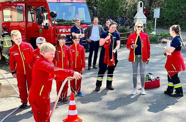 Gute Feuerwehrmänner und Frauen seien auch im Bereich Erste Hilfe gut ausgebildet und "so musste ein verletzter Fahrradfahrer versorgt werden". An der letzten Station galt es demnach zu löschen. "Dabei mussten mit einer Kübelspritze Symbole an einer Wand getroffen beziehungsweise ausgelöscht werden."