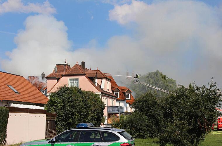 Das Feuer griff auf einen benachbarten Dachstuhl über, der komplett niederbrannte. Der entstandene Sachschaden beläuft sich nach ersten Schätzungen auf mehrere Hunderttausend Euro.