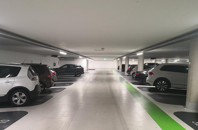 Derzeit bestehen 70 konventionelle Stellplätze für Pkw in der Tiefgarage. Hinzu kommen noch drei Behindertenstellplätze und vier öffentliche Ladeplätze für E-Fahrzeuge sowie insgesamt vier Stellplätze für städtische Dienstfahrzeuge (davon zwei mit E-Ladeanschluss). Im Mai wird ein Kfz-Stellplatz umgewandelt und mit einer derzeit ungenutzten Fläche verbunden, um daraus einige Stellplätze für motorisierte Zweiräder zu schaffen.