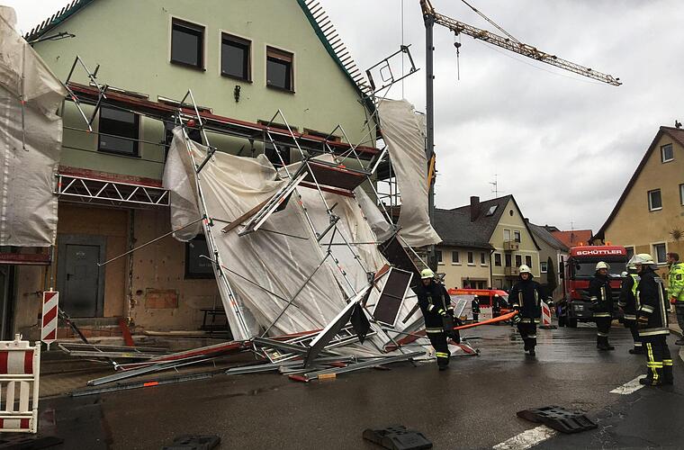 Stürmischer Samstag in Mittelfranken: Randtief Eckhart hat mit Sturmböen in Wilhermsdorf im Landkreis Fürth dafür gesorgt, dass ein Gerüst teilweise eingestürzt ist.