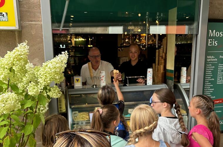 Der Andrang an der Eisdiele Mosena in der Nürnberger Straße war groß und Bürgermeister Thomas Zwingel hatte sichtlich Spaß bei der Eisausgabe. Zwei Stunden dauerte die Aktion, bei der rund 150 Kugeln Eis über die Theke der Eisdiele gingen. Ein rundum gelungener Start für die Zirndorfer Schülerinnen und Schüler in die wohlverdienten Sommerferien.