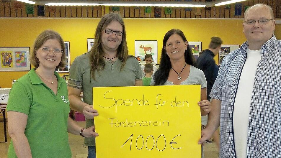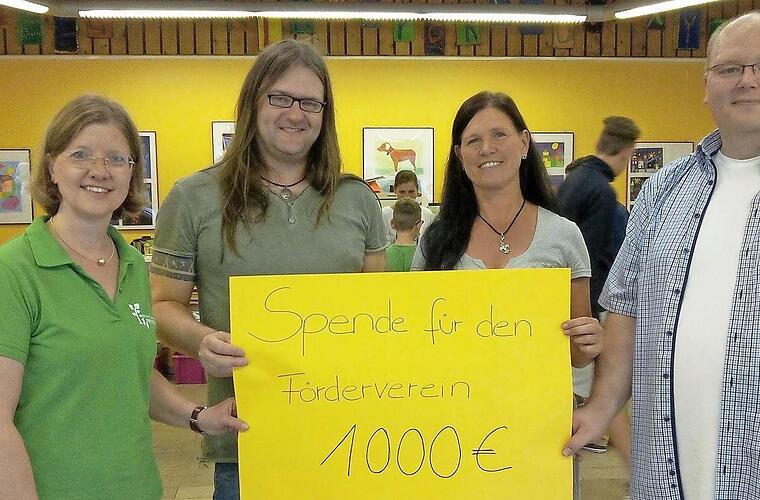 Ermöglicht hatte diesen Auftritt auch eine großzügige Spende. So war es auch eine besondere Freude, dass im Rahmen des Schulfestes eine Spendenübergabe an den Förderverein stattfand. Uwe Igel, Bandleader der Pretzfelder Band X-Large und auch Schülervater, überreichte an den Vorsitzenden Jens Götz und seine Stellvertreterin Petra Zeißler eine Spende in Höhe von 1000 Euro aus dem Erlös des Jubiläumskonzerts der Band, das vor einigen Wochen in der Pretzfelder Turnhalle über die Bühne ging.
