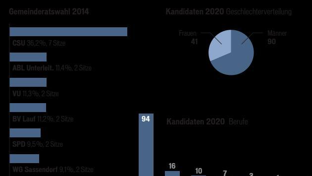 Von 131 Kandidaten sind 41 Frauen, 90 Männer. Die meisten Bewerber (94) sind Angestellte, gefolgt von Selbständigen (16) und Beamten (10). Sieben Ruheständlern stehen drei Schüler bzw. Stundenten gegenüber. red