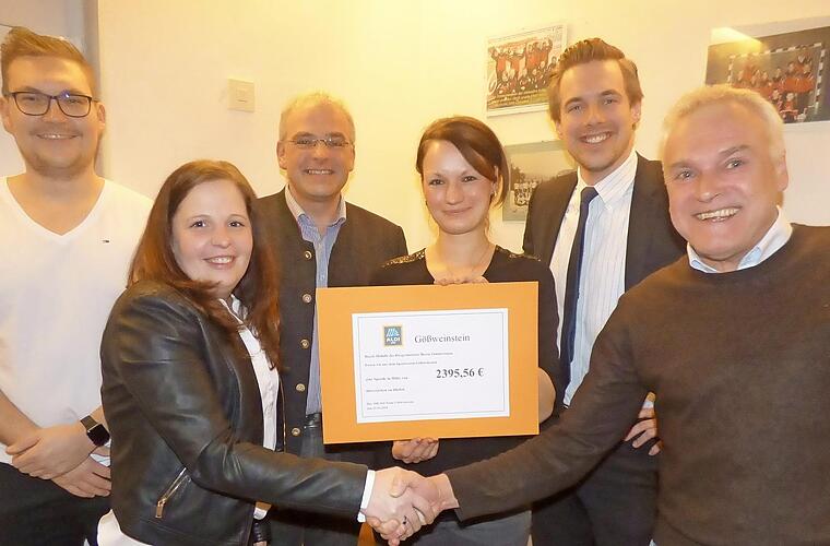 Zur Mitgliederversammlung des SV Gößweinstein war Aldi-Regionalleiter Johannes Moosmeier mit der Gößweinsteiner Aldi-Marktleiterin Iris Schüpferling und ihrer Stellvertreterin Susan Behr gekommen, um für die Jugendarbeit des Vereins eine Spende in Höhe von ganz genau 2395,56 Euro zu übergeben. Dieser Betrag kam bei der Ein-Jahres-Feier des Gößweinsteiner Aldi-Marktes in nur einer Stunde als Einnahmen herein, als Bürgermeister Hanngörg Zimmermann (BMG) als Supermarktkassier an der Kasse saß.