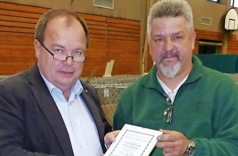 Als Vereinsmeister Geflügel grüßte Hermann Dörfler aus Traindorf, der für seine Hühner Orloff rotbunt 382 Punkte bekam, vor Manfred Schneck aus Walberngrün (Zwerg-Orpington schwarz, 381).