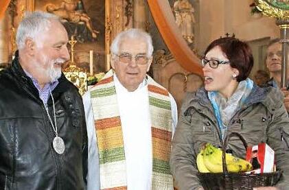 Unter dem Beifall der Pilger überreichte Evi Engel einen Geschenkkorb, unter anderem mit Bananen als Stärkung für die Ausdauer und - angesichts seiner derzeit angeschlagenen Gesundheit - mit Doppelherz.