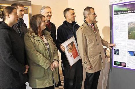 "Physik des Lichts." Worum geht es? 15 Physikstudenten der Uni Bayreuth haben sich viel Mühe gemacht, um den Besuchern anhand von Schautafeln und Erklärungen das Licht in der ganzen Vielfalt näherzubringen. Es geht dabei unter anderem um die Entstehung von Regenbögen, um Himmelsfarben, die Messung von Lichtgeschwindigkeit mit Schokolade, es geht um Lichtphänomene am Himmel.Weiterhin um die Fluoreszenz und um Lichtgeschwindigkeit.
