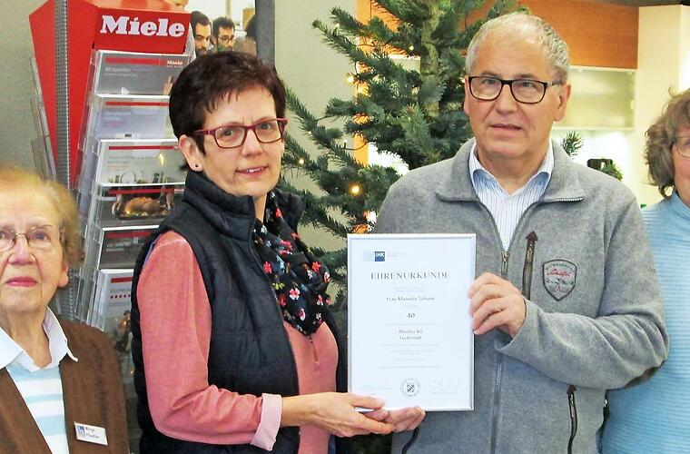 Auf 40 Berufsjahre in der Firma Pfeuffer kann Manuela Schunk zurückblicken, eine der ersten Auszubildenden im Fuchsstädter Fachgeschäft für Haushalt und Technik. Ihre langjährige Treue und Verlässlichkeit würdigte Besitzer Hermann Pfeuffer und seine Familie in einer Feierstunde, in der er auch die Ehrenurkunde der IHK Würzburg-Schweinfurt übergab.