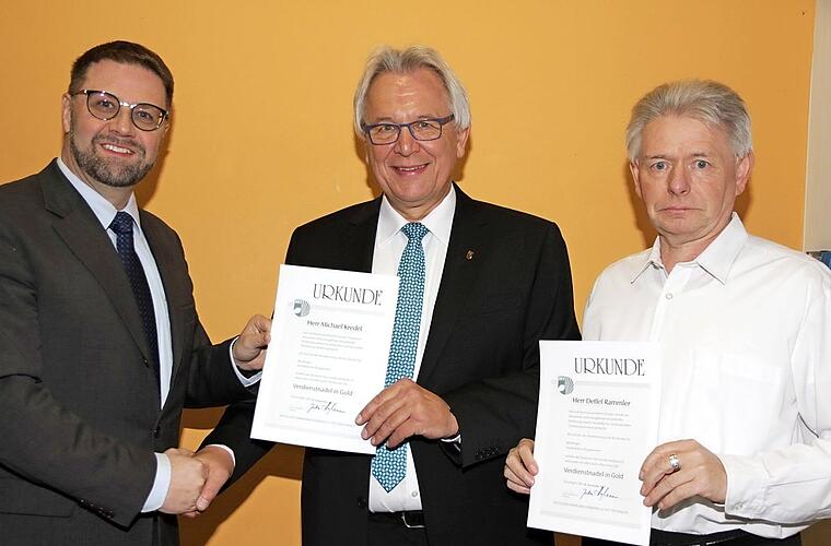 Ein besonderes Lob und höchste Anerkennung sprach er Detlef Rammler aus Buckenhofen und Michael Kredel, dem Dirigenten des Forchheimer Orchesters, aus. Beide musizieren seit 50 Jahren auf dem Akkordeon. Bei ihnen zählen die Mitgliedschaft im damaligen Hohner-Akkordeonorchester Forchheim unter der Leitung von Herbert Bartl dazu, da die "Rhythmische Harmonika Forchheim" erst 1978 gegründet wurde und seitdem Mitglied im Deutschen Harmonika-Verband ist.