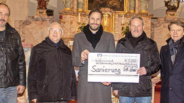 Die St.-Veit-Kapelle ist nicht nur ein beliebter Ort zum Heiraten, auch viele Urlauber und Wanderer bestaunen diese. Damit das so bleibt, müssen die elektrischen Leitungen der Kapelle erneuert werden. Hierzu stellt die Raiffeisen-Volksbank Bad Staffelstein der katholischen Filialkirchenstiftung St. Veit Dittersbrunn eine Spende über insgesamt 5000 Euro zur Verfügung. Auf dem Bild von links: Winfried Lieb (Pfarrgemeinderat), Udo Zettelmeier (Pfarrer im Ruhestand), Christoph Lieb (Vorstand der Raiba Bad Staffelstein), Bernhard Engert (Kirchenpfleger), Karl Mahr (Filialleiter der Raiba Kleukheim) Foto: Hartmut Klamm