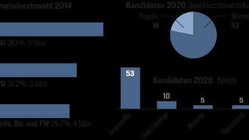 Da hatte es Deinlein insofern nicht ganz leicht, da die SPD mit fünf Sitzen ebensoviele hatte wie die CSU. Diesen liegen 32,2 (SPD) beziehungsweise 38,1 Prozent der Stimmen zugrunde. Somit wurde die Fraktion der Werktätigen Bürger und Freien Wähler (WBFW, vier Sitze) immer zur entscheidenden Größe. Neben SPD und CSU tritt auch WBFW wieder an.