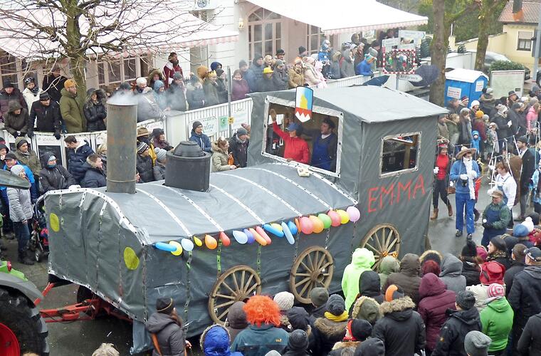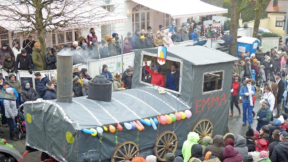 Die "Asfölder" aus Ober- und Unterailsfeld hatten die Lokomotive "Emma" von Jim Knopf von der Augsburger Puppenkiste nachgebaut und liefen als Marionetten dahinter her.