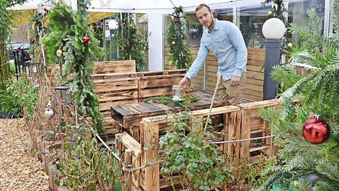 Elf Kubikmeter voller Hackschnitzel, für das wärmende Gefühl an den Füßen, und rustikale Tische aus Holzpaletten sind schon ausgebracht beziehungsweise aufgestellt. Ebenso wie Bäumchen und weitere Weihnachtsdeko.
