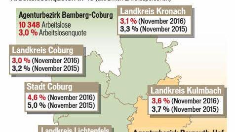 Auch im November ist die Arbeitslosigkeit im Agenturbezirk Bamberg-Coburg weiter zurückgegangen, jedoch nicht mehr so stark wie im Oktober. Die Zahl der Arbeitslosen sank um 196 Personen (-1,9 Prozent) auf 10 348. Heuer fiel der Rückgang um 4,3 Prozent größer aus als im letzten Jahr. Die Arbeitslosenquote beträgt 3,0 Prozent. Der Agenturbezirk Bamberg-Coburg erreicht erstmals seit seinem Bestehen in diesem Monat die Marke zur Vollbeschäftigung. Per Definition spricht man davon ab einer Arbeitslosenquote von 3,0 Prozent. Die Arbeitslosigkeit ist weiterhin auf dem niedrigsten Stand seit 1980. Die Zahl der Arbeitslosen ist in den letzten zwölf Monaten um 539 Personen (-5,0 Prozent) gesunken. Vor einem Jahr waren 10 887 Männer und Frauen bei einer Quote von 3,2 Prozent arbeitslos gemeldet.