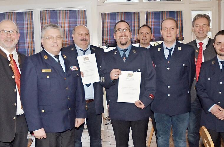 Zusammen mit Bürgermeister Egon Herrmann konnte der scheidende Vorsitzende Christof Wagner mit Georg Wohlrath (60 Jahre Treue), Manfred Schosch (50 Jahre Treue) und Tino Michel (25 Jahre Treue) drei langjährig treue Mitglieder ehren und für ihre Loyalität zur Wehr danken.