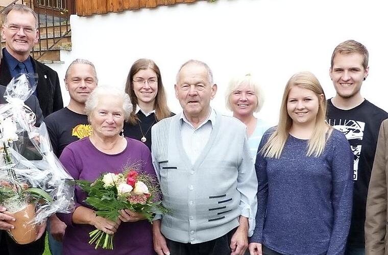 Alma ist eine gebürtige Untersteinacherin. Max Wetscheck stammt aus Niederbayern und arbeitete als Installateur im Großraum Stuttgart. Er brachte damals mit seinem Motorrad einen Arbeitskollegen heim nach Ramsenthal und lernte abends beim Kerwa-Tanz seine Alma kennen. Bei weiteren Treffen kamen sich beide näher, und vor sechs Jahrzehnten gaben sie sich in der St.-Oswald-Kirche in Untersteinach das Jawort. Die Ehe ist mit drei Kindern gesegnet, zwei Enkel machen das Familienglück perfekt. Die besten Glück- und Segenswünsche der Kirche sprach Pfarrer Wolfgang Oertel aus. Für die Gemeinde Untersteinach gratulierte Bürgermeister Volker Schmiechen zum Jubiläum und wünschte Alma und Max Wetscheck noch viele gemeinsame Jahre im Familienkreis. Für den Landkreis Kulmbach gratulierte Kreisrat Heinz Burges zur Diamanten Hochzeit.