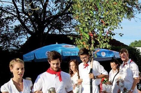 Acht Paare zogen ihre Kreise um den Kirchweihbaum neben dem Sportheim des 1. FC Niederlindach, beobachtet von zahlreichen Kirchweihbesuchern. Mit Blasmusik holten die Burschen die Mädchen ab und banden sich die mit Blumen geschmückten Schürzen um.