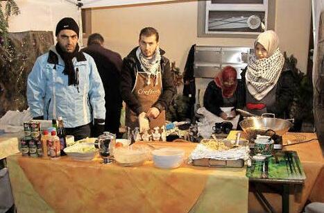Die Flüchtlinge suchen den Kontakt zur Bevölkerung. So waren sie einige Tage vor der Podiumsdiskussion mit einem Stand auf dem Weihnachtsmarkt vertreten und bereiteten Falafel, knusprig frittierte Bällchen, zu.