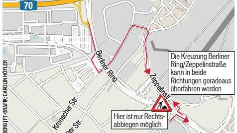 - Aus der Rodezstraße und der Zeppelinstraße kann nur nach rechts in den Berliner Ring eingefahren werden.