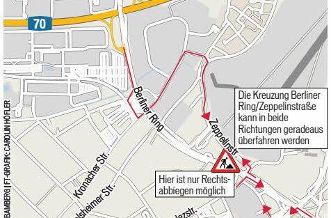 - Auf dem Berliner Ring stehen in Richtung Nürnberg bzw. Hallstadt nur die Geradeausspur zur Verfügung, die Rechtsabbiegemöglichkeit bleibt, das Linksabbiegen (stadtein- und stadtauswärts) ist unterbunden. So ist die Zufahrt in die Zeppelinstraße aus Richtung Memmelsdorfer Straße kommend frei. Aus Richtung Hallstadt kann in die Rodezstraße abgebogen werden.