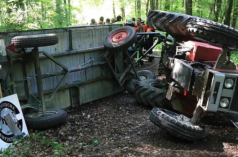 In einem Waldstück bei Falkenstein fand die muntere Fahrt am Samstag gegen 17 Uhr ein jähes Ende. Nach den derzeitigen Erkenntnissen wurde ein Hang dem Traktor und Anhänger mit offener Ladefläche zum Verhängnis. Aus bislang ungeklärter Ursache, so die Polizei, kippte das Gespann auf dem Feldweg auf die Seite.