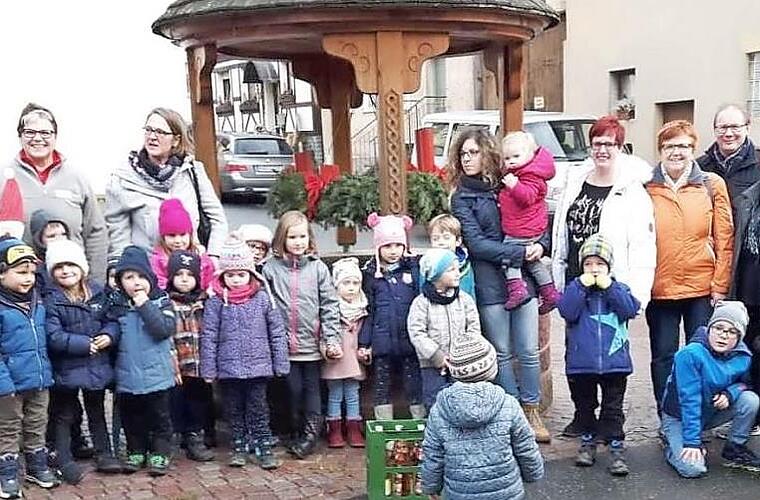 Die in diesem Jahr sehr üppig ausgefallene Apfelernte an den Bäumen entlang der Seeshofer Straße nahm der Obst- und Gartenbauverein Hammelburg zum Anlass, den Hammelburger Kindergärten und der Kinder-Kiste eine Spende zukommen zu lassen. Im Rahmen des Hammelburger Altstadtadvents übereichten die Vorsitzenden Ute Merz und Monika Ruppert am Wankelbrunnen Saft-Gutscheine und zusätzlich Bargeldspenden. Die Spenden wurden von den Leiterinnen der jeweiligen Einrichtung in Anwesenheit von Pfarrer Eschenbacher und Kindern mit Eltern entgegengenommen. red