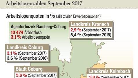 Im Landkreis Kulmbach war der Arbeitsmarkt ebenfalls vom Start ins neue Schul- und Ausbildungsjahr geprägt. Die Zahl der Arbeitslosen sank um 59 auf 1541. Das waren 129 weniger als ein Jahr zuvor. Die Arbeitslosenquote ging um 0,1 Prozentpunkte auf 3,8 Prozent zurück. Im September 2016 lag sie bei 4,1 Prozent.