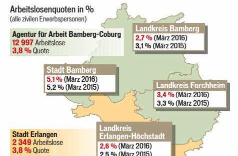Im ländlichen Raum, wie im Landkreis Forchheim (-5,3 Prozent), geht die Arbeitslosigkeit im Frühjahr kräftiger zurück als in den Städten.