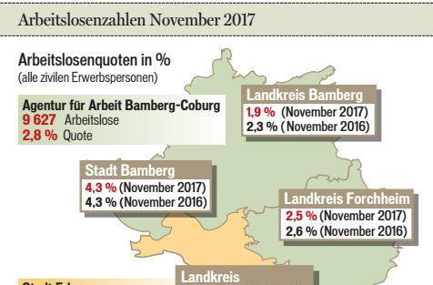Im November ist im Agenturbezirk Bamberg-Coburg die Zahl der Arbeitslosen zum Herbstausklang nochmals weiter gesunken. Im Gegensatz zum Goldenen Oktober (-7...