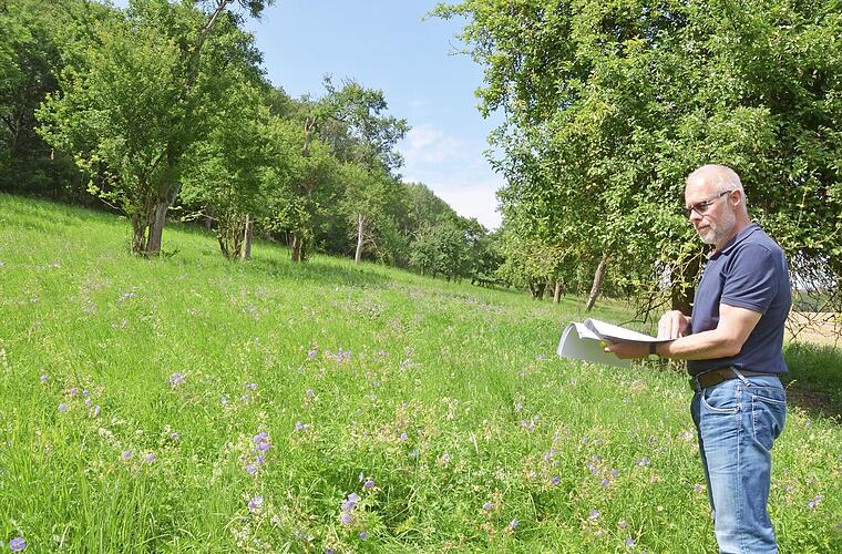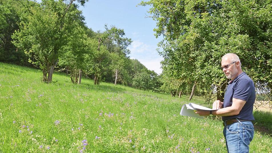 Vor Ort erklärt LPV-Geschäftsführer Frank Reißenweber, was gerade in Oettingshausen geplant ist. Dort geht es um mehrere Streuobstwiesen südwestlich und nördlich des Dorfes. "Wir wollen die Altbestände pflegen lassen", sagt er. Ein Profi soll das Ausschneiden übernehmen. Ausgenommen sind die uralten Bäume, bei denen sich die Mühe nicht mehr lohnen würde. Wo Bäume bereits ausgefallen sind, wird es Ersatzpflanzungen geben. "Wir setzen bei Neupflanzungen auf alte Sorten, die für die Region typisch sind", erklärt er.
