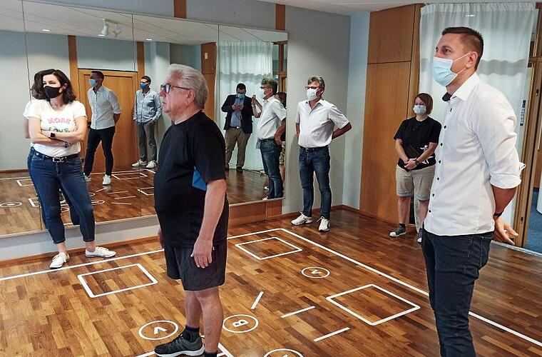Karl-Heinz Werb demons-trierte der Staatsministerin einzelne Trainingsbausteine des Skillcourts. Der 71-Jährige hatte vor fünf Jahren einen Schlaganfall. Schon eine Woche später war er dank des Sports wieder auf den Beinen, sowohl mental als auch physisch. Er und Dorothee Bär sind sich einig: Körperliche und geistige Fitness gehen Hand in Hand. Deswegen trainiert Karl-Heinz Werb sowohl seine Reaktionsfähigkeit als auch die Bewegung. Etwas kleiner als ein Squash-Court, ausgestattet mit Laser und Monitor, kann im Skillcourt jeder seine Ausdauer, Kraft und Konzentration trainieren.