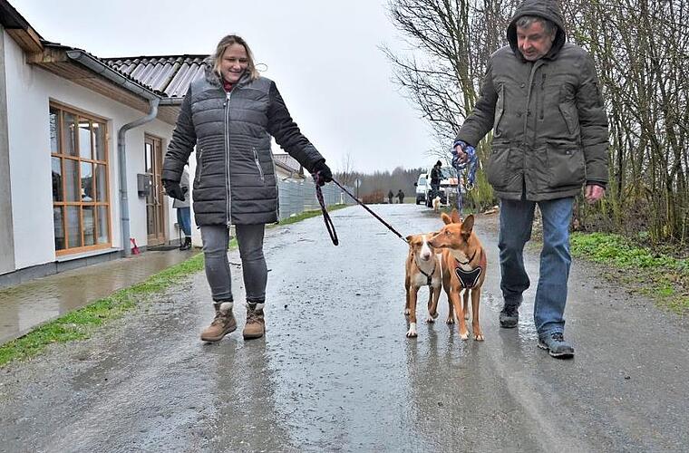 Der Himmel ist grau, es ist kalt und regnet in Strömen. Bei diesem Wetter mag kein Hund vor die Tür. Dieses Sprichwort trifft nicht auf Tinga und Tingo zu. Aufgeregt wedeln der etwa sechsjährige Rüde und seine zwei Jahre jüngere Freundin mit dem Schwanz, während die Tierheim-Mitarbeiterin ihnen Leinen anlegt. Vor der Tür warten schon die freiwilligen Gassi-Geher auf das dynamische Duo. Voller Vorfreude springen die beiden Spanier hoch, schmiegen sich an ihre Beine und lecken dankbar die Hände, die sie streicheln.